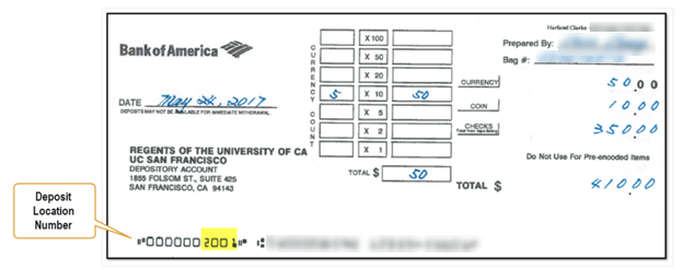 - Complete a UCSF pre-printed deposit slip. UCSF pre-printed deposit slips include UCSF bank account details and a unique four-digit code in the bottom left corner, referred to as the deposit location number. Each department is assigned a unique deposit location number to track and identify deposits when they reach our bank.- Ensure total deposit amount is accurate