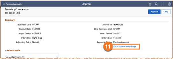 - Approvers should use the Go to Journal Entry Page link to review the journal in its entirety before approving.