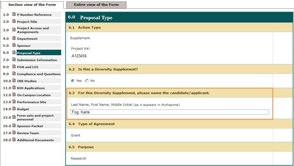 The Proposal Type is marked as a Diversity Supplement when creating the proposal record. The name of the candidate/applicant for the diversity supplement must be provided.