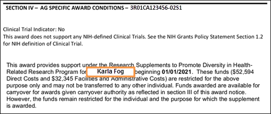 All diversity supplements must be managed separately and are restricted for the use as defined in the proposal. Check IC specific Notices of Special Interest (NOSI) and/or IC website for specific restrictions on your awarded Diversity Supplement. These restrictions typically include that: