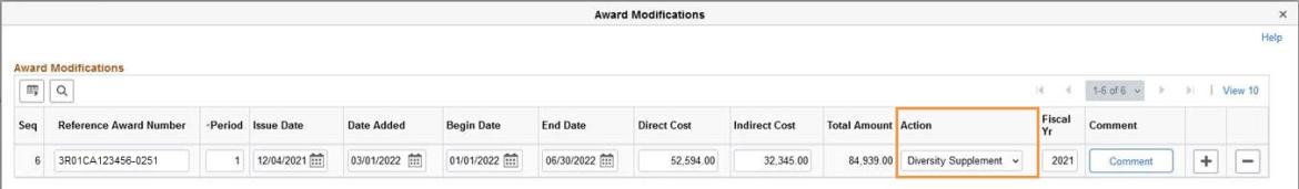 The Award Modifications page will indicate a row with an Action type of Diversity Supplement.