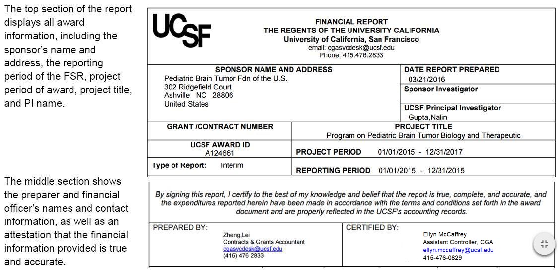 This guide explains that private sponsors require financial reports and UCSF notifies the research administrator and principal investigator 45 days before the deadline.