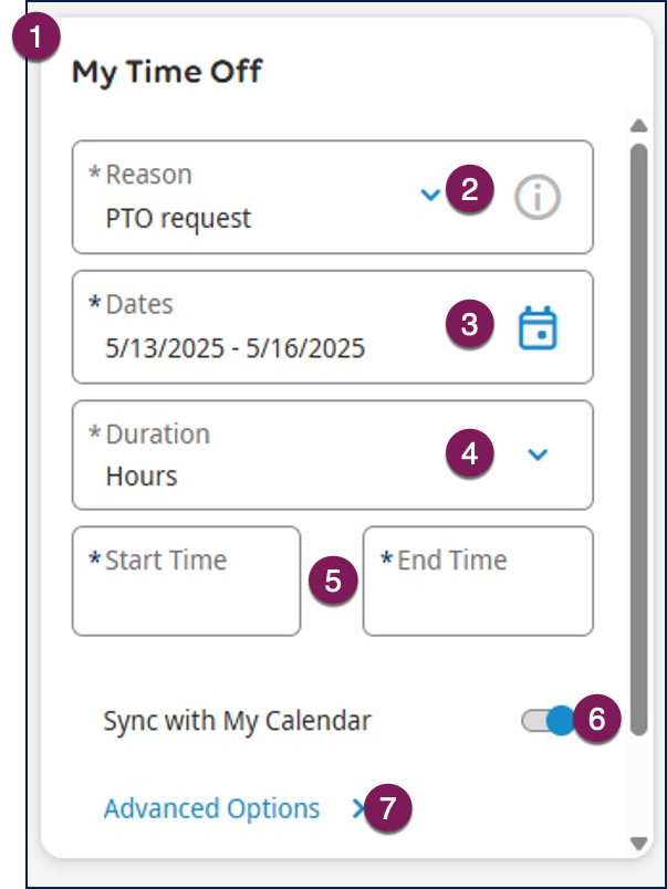 - Choose the type of accrued time you would like to deduct from as your Reason. If an accrued time type is missing from the drop-down list, select Advanced Options for additional request types.