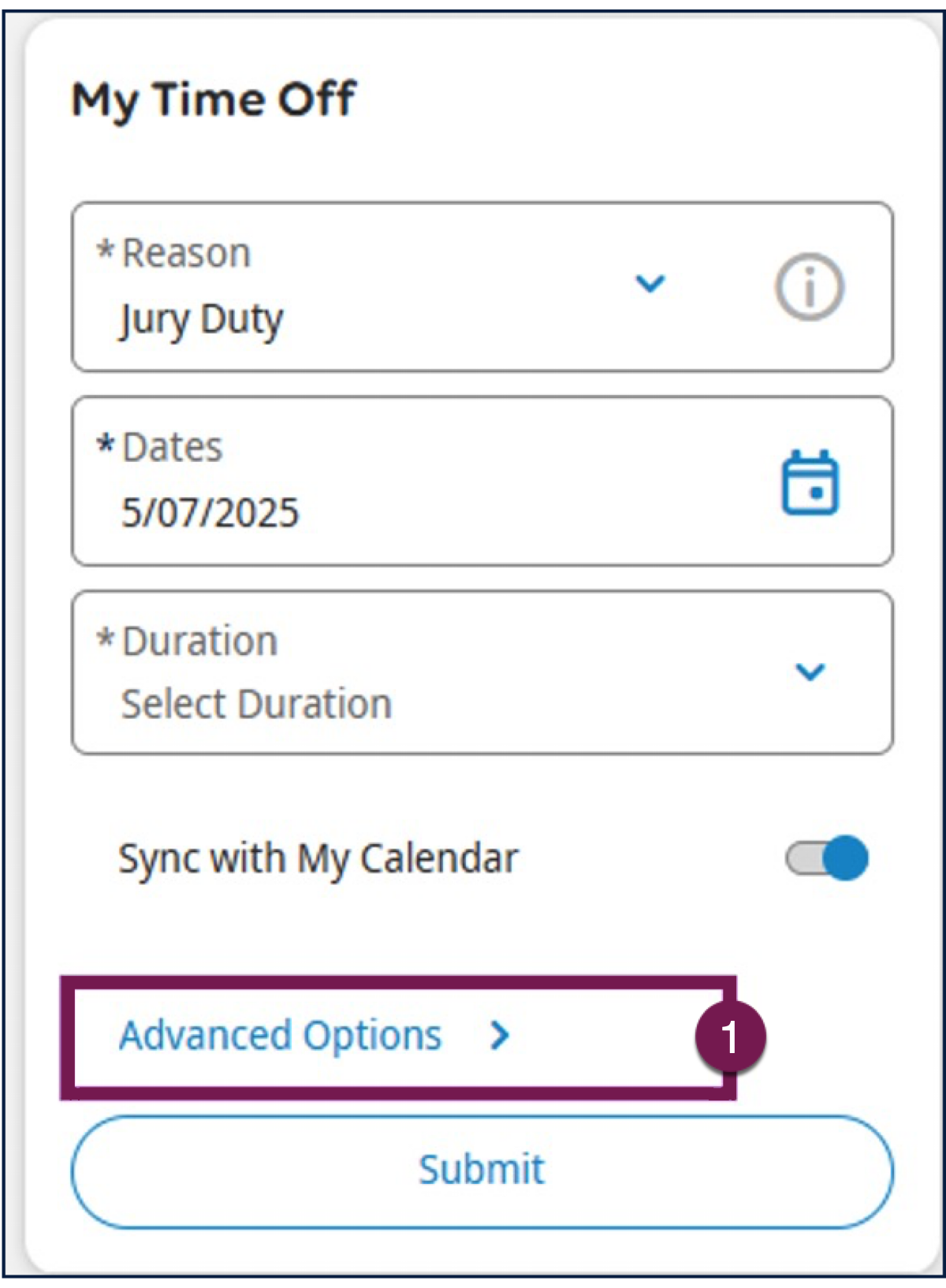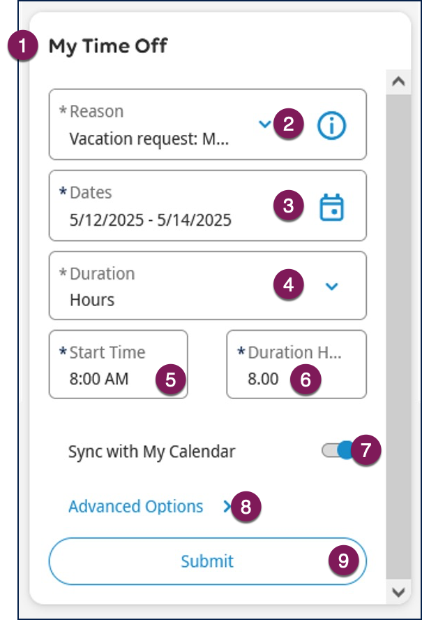 - Optional: Choose Sync with My Calendar to add the time off request to your personal calendar, such as Outlook.
