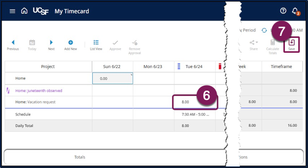 A new row is added to the timecard for each Paycode you selected. On the new row(s), locate and click the day of the week of your time off and enter the number of hours you used. Repeat steps 3-6 if you need to add additional Paycodes for the pay period.