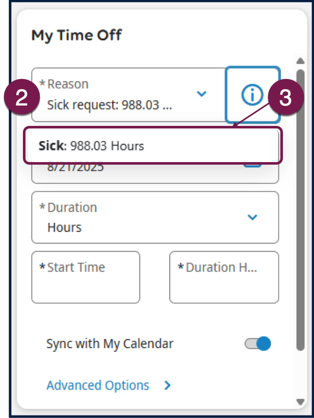 - Click or tap the “i” icon to the right of your selected time off type to view the corresponding accrual balance.