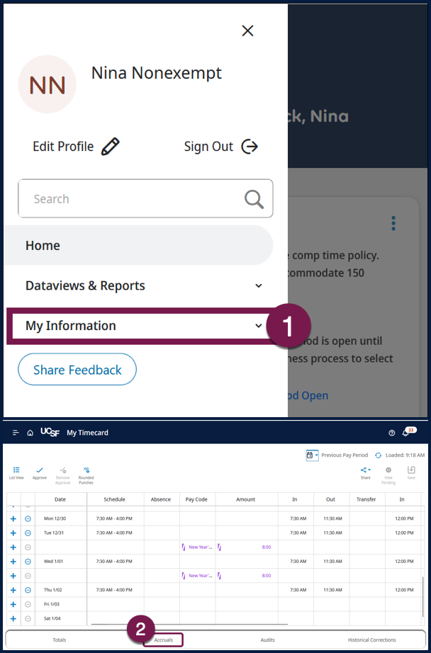 - At the bottom of the timecard select Accruals tab.